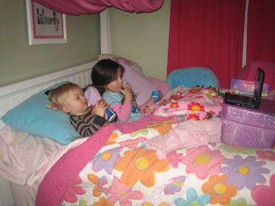 Libby snuggling up to Rocco. When we got home all she talked about was when Rocco can come over to play at her house. She says she needs to show him some things....I think she means her toys. Libby is 4 days older then Rocco (May 6th & May 10th).